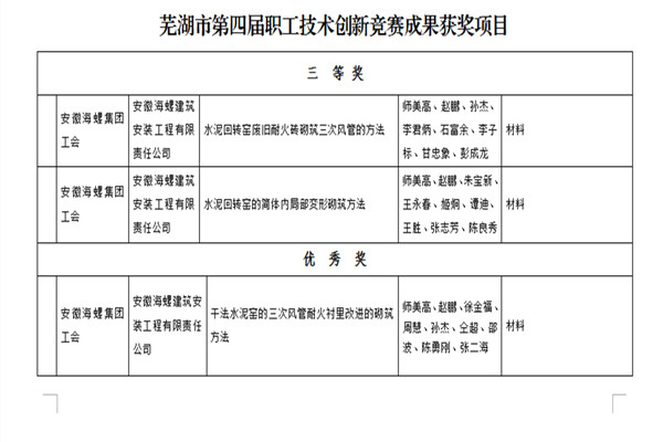 近日,蕪湖市總工會、蕪湖市科學(xué)技術(shù)局、蕪湖市發(fā)明協(xié)會等三家單位聯(lián)合組織開展了職工技術(shù)創(chuàng)新競賽活動,海螺建安公司首次參加此項(xiàng)活動,申報(bào)三個項(xiàng)目全部獲獎。