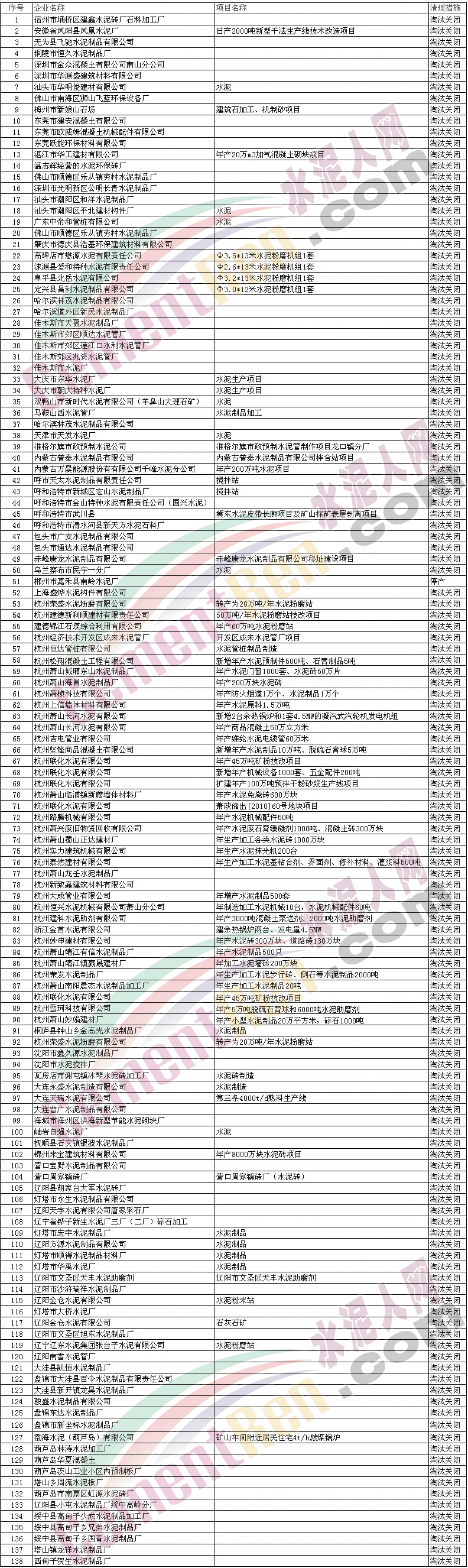 為增加行業(yè)信息的透明性,方便大家在選擇客戶與供應(yīng)商時作為參考,也為方便大家,如果與被淘汰關(guān)閉的企業(yè)或項目有業(yè)務(wù)來往,能提前做出應(yīng)對措施。水泥人網(wǎng)統(tǒng)計出廣東、上海、天津、安徽、遼寧等地區(qū)水泥企業(yè)及項目淘汰關(guān)閉共138家,附名單如下: