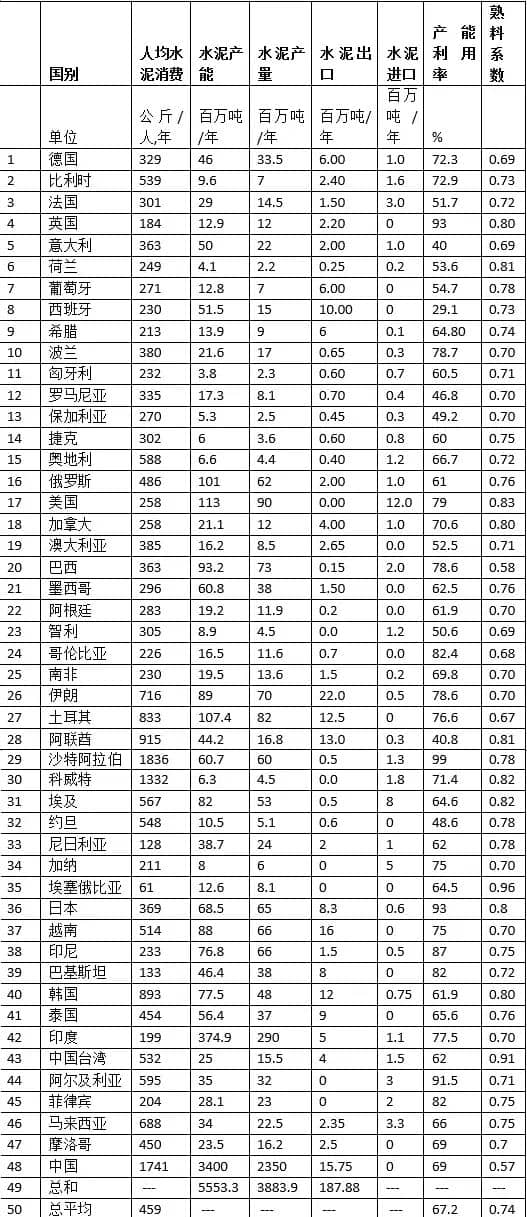 表1 世界主要國家(地區(qū))水泥產(chǎn)能利用率及其熟料系數(shù)匯總圖