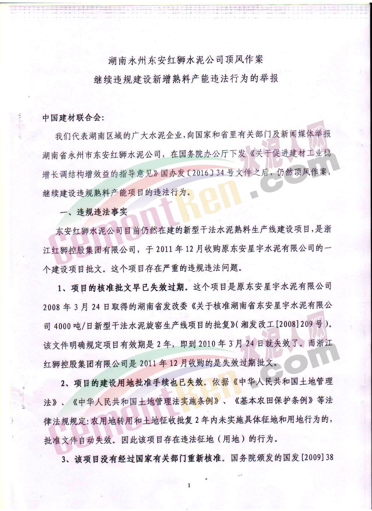 水泥產(chǎn)能?chē)?yán)重過(guò)剩已是中國(guó)水泥行業(yè)不爭(zhēng)的事實(shí)。盡管中央三令五申“嚴(yán)禁建設(shè)新增產(chǎn)能項(xiàng)目”,但依舊有部分水泥企業(yè)屢次越界,觸碰產(chǎn)能紅線。近日,有人向水泥人網(wǎng)爆料,湖南永州東安紅獅水泥公司頂風(fēng)作案,繼續(xù)違規(guī)建設(shè)新增熟料產(chǎn)能。舉報(bào)材料如下: