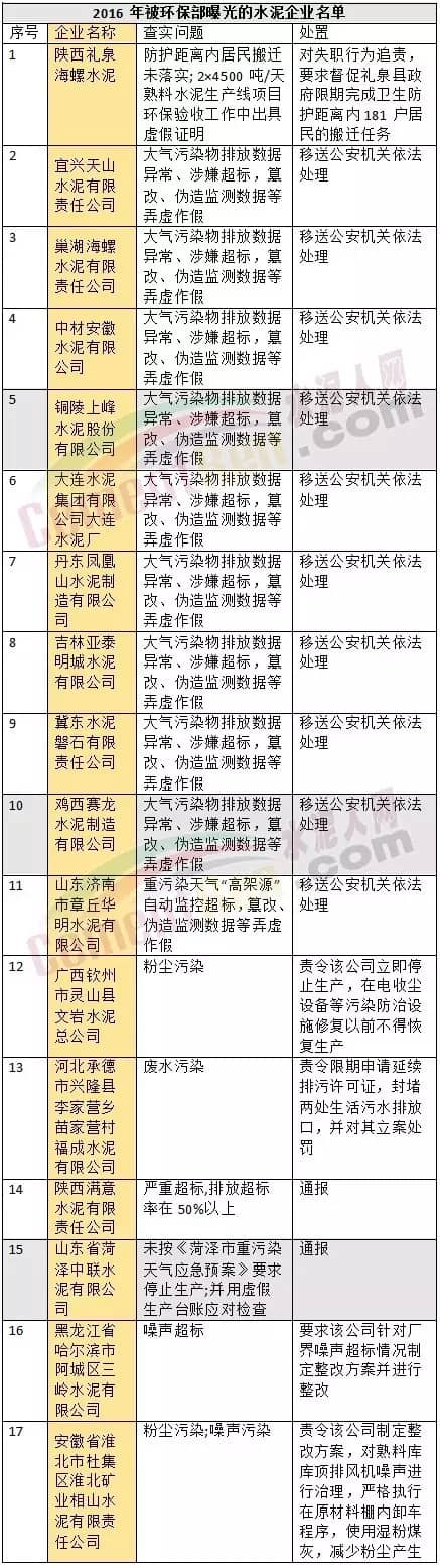 環(huán)保督察的高調(diào)執(zhí)行,一方面加強(qiáng)了督察的力度和聲勢(shì),悍衛(wèi)了環(huán)保法的權(quán)威;另一方面也曝光了企業(yè)的一些問題。這些問題在督察中暴露,能夠迫使地方政府主要負(fù)責(zé)人下決心解決。被環(huán)保部曝光的17家水泥企業(yè),列表如下: