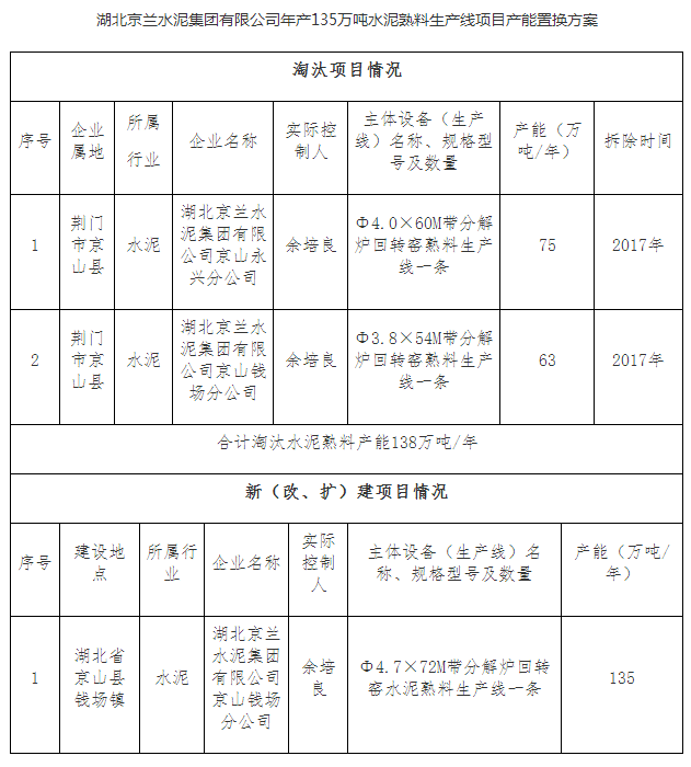 附:湖北京蘭水泥集團(tuán)有限公司年產(chǎn)135萬(wàn)噸水泥熟料生產(chǎn)線項(xiàng)目產(chǎn)能置換方案
