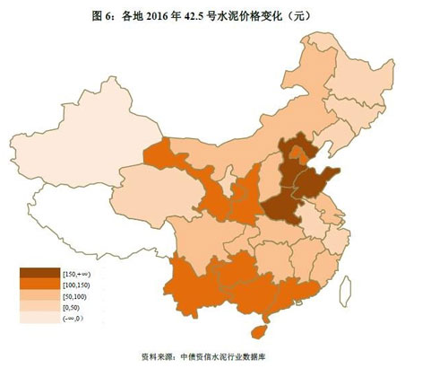 華北地區(qū)由于基數(shù)較低,得益于京津冀地區(qū)需求回暖、金隅冀東整合帶來競(jìng)爭(zhēng)秩序改善等因素,全年42.5號(hào)水泥價(jià)格漲幅117元,居全國首位,價(jià)格水平亦從2015年末全國末尾攀升至第二位;東北地區(qū)往年在黑龍江、吉林良好競(jìng)爭(zhēng)秩序支撐下價(jià)格處全國高位,但2016年在需求低迷背景下價(jià)格漲幅較小,截至2016年末價(jià)格已處倒數(shù)第二位。