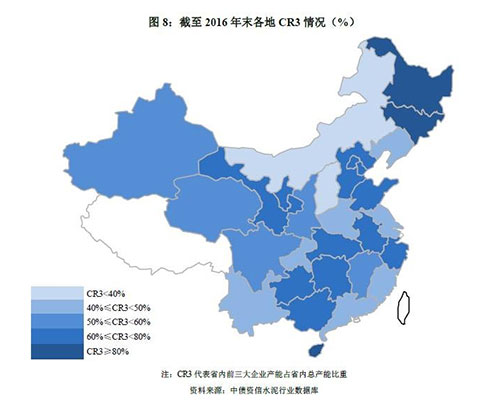 分區(qū)域看,兩湖、長三角等地區(qū)較好的競爭秩序和主導(dǎo)企業(yè)間相對成熟的競爭策略利于區(qū)域價格維持合理水平;東北地區(qū)黑吉兩省集中度雖較高,但脫離需求基礎(chǔ)的協(xié)同效果已逐漸趨弱,正如上文所提,2016年東北地區(qū)水泥價格漲幅全國墊底;山西和內(nèi)蒙是全國水泥區(qū)域產(chǎn)能集中度最低的兩個省份,區(qū)域內(nèi)尚未形成具有明顯優(yōu)勢的龍頭企業(yè),低迷的需求疊加較差的競爭秩序?qū)ξ磥韰^(qū)域價格走勢形成制約。