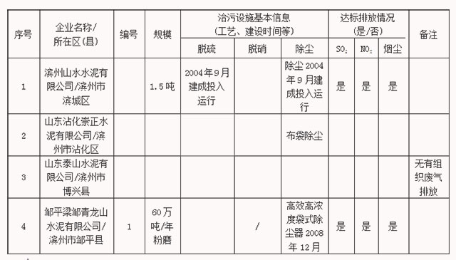山東省濱州市落實(shí)《山東省區(qū)域性大氣污染物綜合排放標(biāo)準(zhǔn)》2016年12月份執(zhí)行情況“雙曬”清單已經(jīng)公布。其中含四家水泥企業(yè): 1 濱州山水水泥有限公司 2 山東沾化崇正水泥有限公司 3 山東泰山水泥有限公司 4 鄒平梁鄒青龍山水泥有限公司