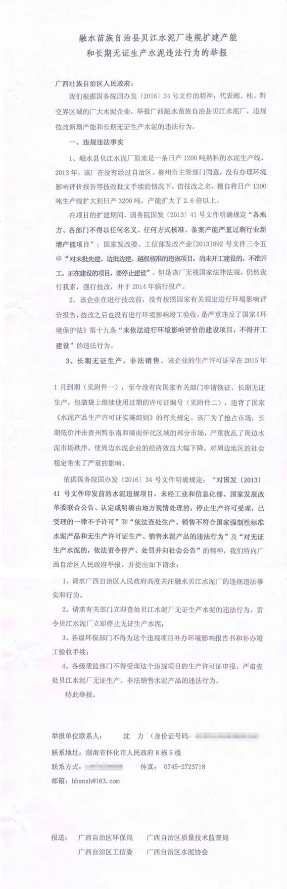材料指出,融水縣貝江水泥廠原來(lái)是一條日產(chǎn)1200噸熟料的水泥生產(chǎn)線。2013年,該廠在沒(méi)有經(jīng)過(guò)自治區(qū)、柳州市主管部門(mén)同意,沒(méi)有辦理環(huán)境影響評(píng)價(jià)報(bào)告等技改批文手續(xù)的情況下,借技改之名,擅自將日產(chǎn)1200噸生產(chǎn)線擴(kuò)大到日產(chǎn)3200噸,產(chǎn)能擴(kuò)大了2.6倍以上。