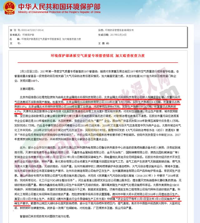 此外,部分企業(yè)存在環(huán)境問題:北京市石景山區(qū)科利源熱電有限公司魯谷供熱服務(wù)中心改造的低氮燃燒器設(shè)備未投入使用,沒有起到減排作用。天津市富萊德有色金屬制品有限公司、千鑫有色金屬制品有限公司、金天馬冶煉廠、國剛鑄模有限公司、津西北園機械鑄造廠等5家鑄造企業(yè)未按要求在2016年11月1日至2017年1月31日期間落實錯峰生產(chǎn),用電量相比其他月份無明顯降低。石家莊市良村經(jīng)濟技術(shù)開發(fā)區(qū)制藥企業(yè)無組織排放,異味嚴重。新化股份有限公司合成氨生產(chǎn)采用重污染固定床造氣工藝,造氣工段產(chǎn)生的廢氣無脫硫脫硝設(shè)施,煤氣洗滌廢水大量污染物逃逸,無組織排放,污染嚴重。滄州市南湖學(xué)校2.5蒸噸燃煤鍋爐未改清潔燃料,大氣污染治理設(shè)施未運行,煤堆未苫蓋。泊頭市部分鑄造企業(yè)未落實錯峰生產(chǎn)要求,滄州永欣鑄造有限公司電爐正在生產(chǎn)、滄州冀源鑄造有限公司產(chǎn)品和電爐有余溫,有夜間生產(chǎn)跡象。唐山市鼎安專用汽車有限公司廢氣處理設(shè)施未通過驗收,未完成《京津冀大氣污染防治強化措施(2016-2017年)》中要求“2016年底前,完成所有石化、化工行業(yè)VOCs綜合整治任務(wù)”。河北省高速公路祿發(fā)實業(yè)總公司唐山服務(wù)區(qū),擅自露天焚燒油煙凈化器收集的廢油,無組織排放問題嚴重。廊坊市鑫佳機電有限公司生產(chǎn)車間廢氣無組織排放,灌環(huán)氧樹脂生產(chǎn)線廢氣處理設(shè)施損壞停運。太原市美琪物業(yè)1臺50噸鍋爐,采用雙堿法脫硫,夜查時發(fā)現(xiàn)脫硫設(shè)施運行不正常,脫硫漿液呈酸性。濟南市諾能生物工程有限公司場內(nèi)異味無組織排放嚴重。科邦化工有限公司氯化車間異味無組織排放嚴重,危險廢物暫存場所沒有設(shè)置圍堰。德州市中聯(lián)大壩水泥有限公司2016年11月擅自進行生產(chǎn),直至11月15日才停止生產(chǎn),未落實《德州市重點行業(yè)冬季錯峰生產(chǎn)工作方案》中明確“該企業(yè)應(yīng)于每年11月1日至次年3月15日實施停產(chǎn)”錯峰生產(chǎn)要求。鶴壁市山城區(qū)大湖村多處居民散燒燃煤,部分位于高污染燃料禁燃區(qū)內(nèi),煙氣直排。焦作市中原路中段西側(cè)大院中,大面積垃圾、樹枝樹葉在肆意焚燒。武陟縣一洗煤廠拉閘斷電、對抗檢查,廠區(qū)煤炭未苫蓋,揚塵污染嚴重。