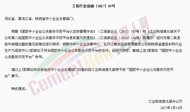 根據(jù)《國(guó)家中小企業(yè)公共服務(wù)示范平臺(tái)認(rèn)定的管理辦法》(工信部企業(yè)〔2012〕197號(hào))和《工業(yè)和信息化部關(guān)于公布第二批國(guó)家中小企業(yè)公共服務(wù)示范平臺(tái)復(fù)核意見的通知》(工信部企業(yè)〔2016〕148號(hào))的要求,經(jīng)對(duì)在第二批復(fù)核中被提出整改意見的單位進(jìn)行測(cè)評(píng),邯鄲市中小企業(yè)發(fā)展中心、牡丹江敏堯?qū)崢I(yè)有限責(zé)任公司和陜西省建筑材料行業(yè)生產(chǎn)力促進(jìn)中心3家單位不符合國(guó)家中小企業(yè)公共服務(wù)示范平臺(tái)的條件,經(jīng)研究決定,撤銷上述3家單位“國(guó)家中小企業(yè)公共服務(wù)示范平臺(tái)”稱號(hào)。
