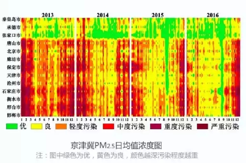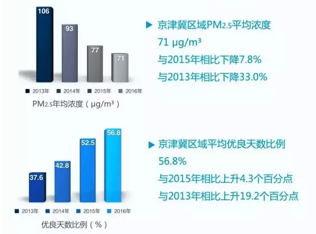 經(jīng)過(guò)三年的協(xié)同治理,京津冀區(qū)域四項(xiàng)主要污染物濃度全面下降,空氣質(zhì)量取得了整體改善。2016年,京津冀區(qū)域13個(gè)城市PM2.5、PM10、SO2和NO2的平均濃度分別為71、119、31和49微克每立方米,較2013年相比分別下降33%、34%、55.6%和4.5%,區(qū)域平均優(yōu)良天數(shù)比例為56.8%,較2013年相比上升19.2%,區(qū)域平均重污染天數(shù)則從2013年的76天減少到33天,下降56.1%。