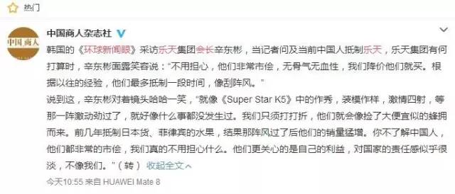 據(jù)中國商人雜志社消息:在《環(huán)球新聞眼》采訪樂天集團(tuán)會長時,當(dāng)記者問及當(dāng)前中國人抵制樂天,樂天集團(tuán)有何打算,他面露笑容說: