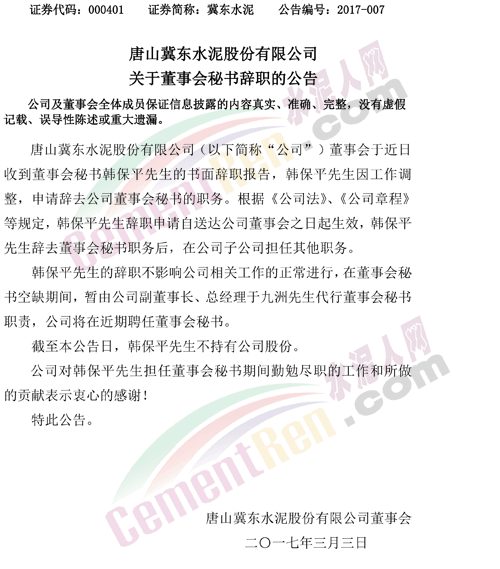 冀東水泥3月3日晚間公告,公司董事會近日收到董事會秘書韓保平先生的書面辭職報告,韓保平先生因工作調整,申請辭去公司董事會秘書的職務。韓保平先生辭去董事會秘書職務后,在公司子公司擔任其他職務。