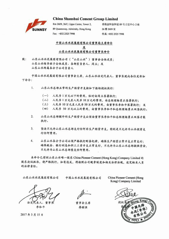 本命令已得到山東山水唯一股東China Pioneer Cement (Hong Kong) Company Limited的股東決議批準(zhǔn),請嚴(yán)格執(zhí)行,如有違反,將按照公司規(guī)章制度和相關(guān)法律法規(guī),追究相關(guān)人員的法律責(zé)任。