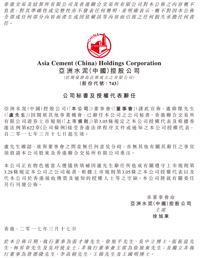 亞洲水泥3月17日發(fā)布公告稱,公司董事會宣布,盧偉杰先生因開展其他事業(yè)機會,已辭任本公司之公司秘書、公司授權代表及等職務,自二零一七年三月十七日起生效。