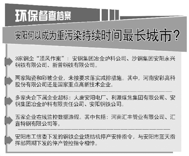 安鋼集團(tuán)冶金爐料公司在安陽(yáng)市啟動(dòng)一級(jí)重污染天氣嚴(yán)格管控情況下,夜間污染物排放量明顯增大,存在超排現(xiàn)象;沙鋼集團(tuán)安陽(yáng)永興鋼鐵有限公司的重污染天氣應(yīng)急管控預(yù)案中I級(jí)響應(yīng)措施未達(dá)到50%的限產(chǎn)要求;安陽(yáng)新南亞陶瓷有限公司未按要求落實(shí)減排措施;河南安彩高科股份有限公司重污染天氣應(yīng)急管控限產(chǎn)措施沒有具體到生產(chǎn)車間和一線工段,無(wú)投料、產(chǎn)量的量化指標(biāo),未嚴(yán)格落實(shí)30%的限產(chǎn)措施;新普鋼鐵有限公司2月6日未嚴(yán)格執(zhí)行安陽(yáng)市藍(lán)天工程指揮部管控停產(chǎn)通知要求,正常生產(chǎn)。