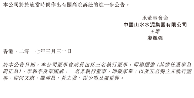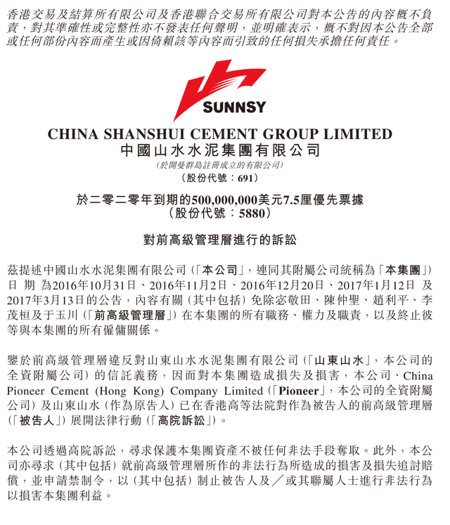 鑒于前高級管理層違反對公司全資附屬公司山東山水的信托義務,因而對集團造成損失及損害,公司、全資附屬公司China Pioneer Cement (Hong Kong) Company Limited及山東山水(作為原告人)已在香港高等法院對作為被告人的前高級管理層展開法律行動。