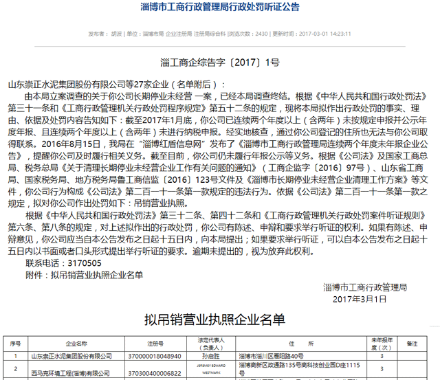 昨日(20170330)上午,記者從淄博市工商局了解到,山東崇正水泥集團(tuán)股份有限公司等27家企業(yè)因連續(xù)兩個(gè)年度以上(含兩年)未按規(guī)定申報(bào)并公示年度年報(bào)、且連續(xù)兩個(gè)年度以上(含兩年)未進(jìn)行納稅申報(bào)被依法吊銷營業(yè)執(zhí)照。
