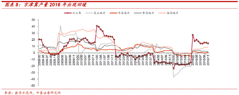從產(chǎn)量角度看,京津冀地區(qū)水泥產(chǎn)量(以河北為主)在2016年出現(xiàn)了明顯回暖趨勢。我們認(rèn)為隨著京津冀一體化的不斷推進(jìn),區(qū)域內(nèi)水泥總體需求仍能維持穩(wěn)定增長。