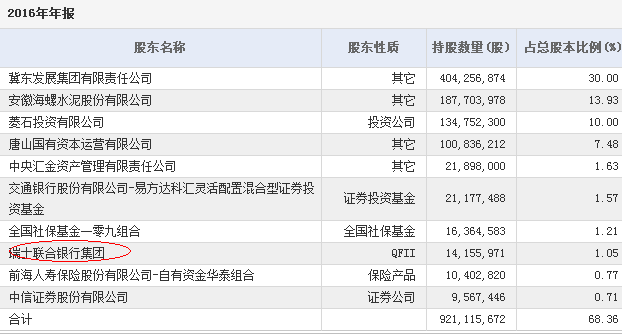 相關(guān)數(shù)據(jù)顯示,2016年年報(bào)中瑞銀集團(tuán)(UBS)位列該股第八大流通股股東,持有14,155,971股,占總股本比例1.05%。