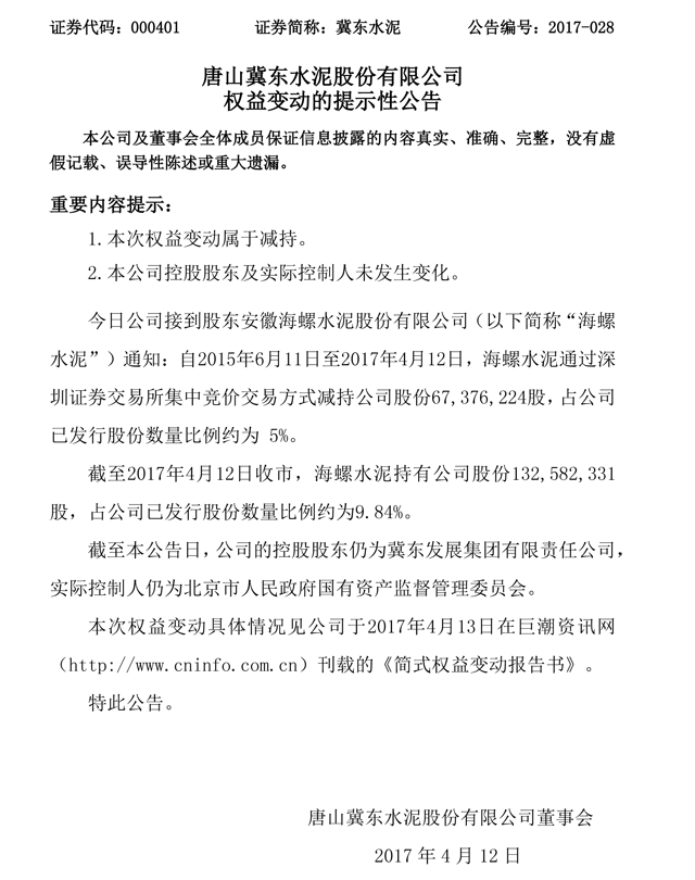 4月12日晚間,冀東水泥(000401)公告稱,當(dāng)日接到股東海螺水泥(600585)通知,自2015年6月11日至2017年4月12日,海螺水泥通過(guò)深圳證券交易所集中競(jìng)價(jià)交易方式減持公司股份67,376,224股,占公司已發(fā)行股份數(shù)量比例約5%。