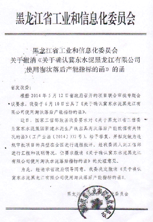 冀東水泥黑龍江新建7200t/d生產(chǎn)線項目為獲得項目批復落后產(chǎn)能置換指標曾兩次涉嫌造假,工信部2014年9月份和2016年3月份曾兩次發(fā)函要求撤銷,并擬定做為違規(guī)審批項目的典型在全國進行通報批評。