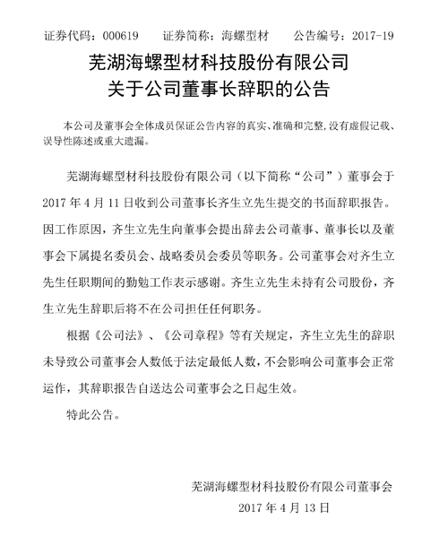 4月12日晚間,海螺型材發(fā)布公告稱,公司董事會于2017年4月11日收到公司董事長齊生立先生提交的書面辭職報告。因工作原因,齊生立先生向董事會提出辭去公司董事、董事長以及董事會下屬提名委員會、戰(zhàn)略委員會委員等職務(wù)。公司董事會對齊生立先生任職期間的勤勉工作表示感謝。齊生立先生未持有公司股份,齊生立先生辭職后將不在公司擔任任何職務(wù)。