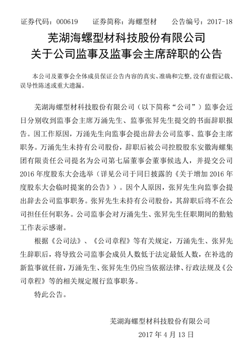 海螺型材同時還公布了公告稱:上市公司監(jiān)事會主席萬涌先生、監(jiān)事張昇先生辭職公告原文如下:
