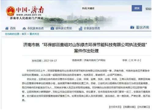 針對4月16日上午,環(huán)保部督查組對山東綠杰環(huán)保節(jié)能科技有限公司執(zhí)法受阻一事,濟南市委、市政府連夜召開緊急會議研究處置措施,認為這是一起阻撓環(huán)保執(zhí)法的惡性事件,性質(zhì)惡劣,影響極壞,必須嚴厲查處。