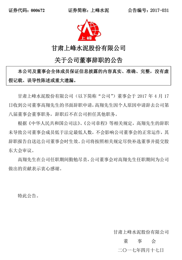 上峰水泥4月17日發(fā)布晚間公告稱,董事會收到公司董事高翔先生的書面辭職申請,高翔先生因個人原因申請辭去公司第八屆董事會董事職務(wù),辭職后不在公司擔任其他職務(wù)。