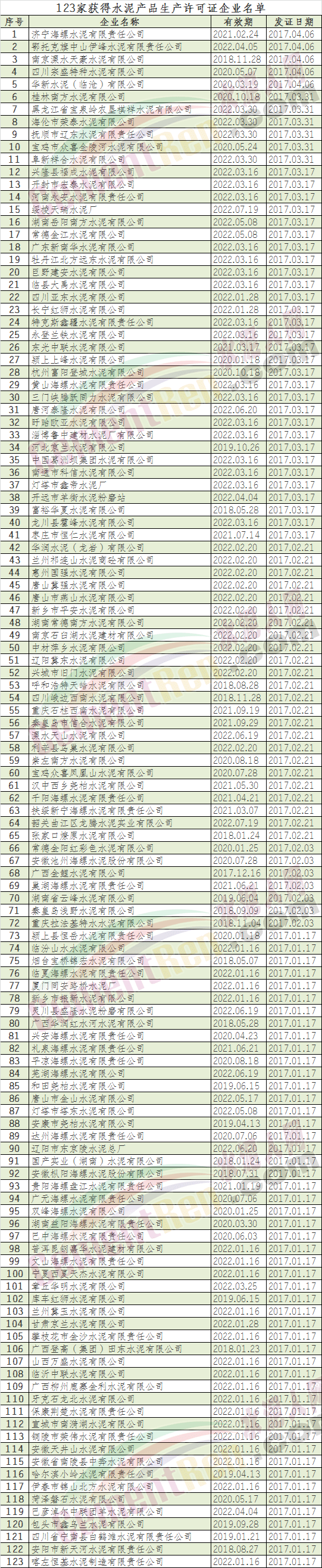 日前,國家質(zhì)量監(jiān)督檢驗(yàn)檢疫總局公布了2017年1月至4月獲證企業(yè)名單,水泥行業(yè)獲得水泥產(chǎn)品生產(chǎn)許可證的企業(yè)有123家,水泥人網(wǎng)匯總列表如下: