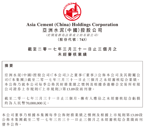 亞洲水泥(中國)(2.37, -0.15, -5.95%)(00743)現(xiàn)價下跌9.13%,報2.29元;成交約42萬股,涉資97萬元。