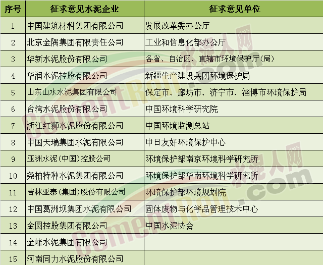 為落實(shí)《控制污染物排放許可制實(shí)施方案》,加快建立和完善覆蓋所有固定污染源的企事業(yè)單位控制污染物排放許可制,環(huán)境保護(hù)部組織制定了《排污許可證申請(qǐng)與核發(fā)技術(shù)規(guī)范 水泥工業(yè)(征求意見稿)》。近日,環(huán)境保護(hù)部發(fā)布關(guān)于征求《排污許可證申請(qǐng)與核發(fā)技術(shù)規(guī)范 水泥工業(yè)(征求意見稿)》國家環(huán)境保護(hù)標(biāo)準(zhǔn)意見的函。征求意見單位名單中包括:中國水泥協(xié)會(huì)及中建材、金隅水泥、華新水泥、華潤(rùn)水泥等15家區(qū)域龍頭企業(yè)