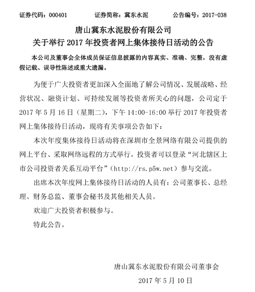 昨日(10日)晚間唐山冀東水泥股份有限公司發(fā)布關(guān)于舉行2017年投資者網(wǎng)上集體接待日活動的公告稱:為便于廣大投資者更加深入全面地了解公司情況、發(fā)展戰(zhàn)略、經(jīng)營狀況、融資計劃、可持續(xù)發(fā)展等投資者所關(guān)心的問題,公司定于2017年5月16日(星期二),下午14:00-16:00舉行2017年投資者網(wǎng)上集體接待日活動。