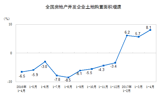 1-4月份,房地產(chǎn)開發(fā)企業(yè)土地購(gòu)置面積5528萬(wàn)平方米,同比增長(zhǎng)8.1%,增速比1-3月份提高2.4個(gè)百分點(diǎn);土地成交價(jià)款2104億元,增長(zhǎng)34.2%,增速提高17.5個(gè)百分點(diǎn)。