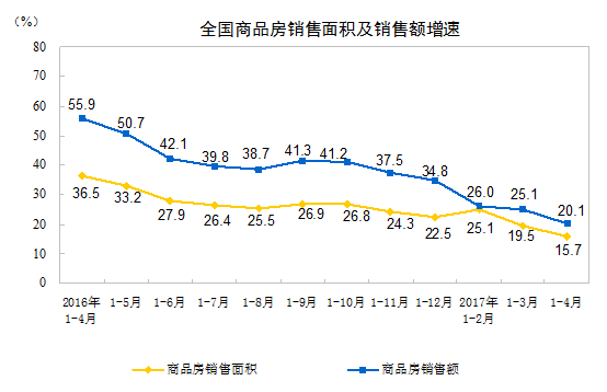 1-4月份,商品房銷售面積41655萬(wàn)平方米,同比增長(zhǎng)15.7%,增速比1-3月份回落3.8個(gè)百分點(diǎn)。其中,住宅銷售面積增長(zhǎng)13.0%,辦公樓銷售面積增長(zhǎng)49.3%,商業(yè)營(yíng)業(yè)用房銷售面積增長(zhǎng)30.6%。商品房銷售額33223億元,增長(zhǎng)20.1%,增速回落5個(gè)百分點(diǎn)。其中,住宅銷售額增長(zhǎng)16.1%,辦公樓銷售額增長(zhǎng)50.4%,商業(yè)營(yíng)業(yè)用房銷售額增長(zhǎng)41.4%。