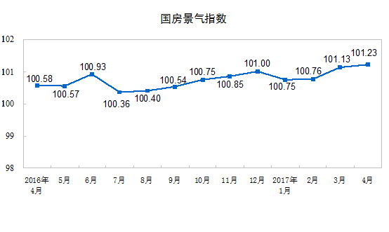 4月份,房地產(chǎn)開發(fā)景氣指數(shù)(簡(jiǎn)稱“國(guó)房景氣指數(shù)”)為101.23,比3月份提高0.10點(diǎn)。