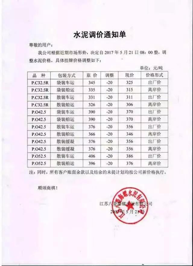 水泥人網從江蘇八菱海螺水泥有限公司了解到自2017年5月21日08:00起調整水泥銷售價格,所有品種下調20元/噸。同時,所有客戶賬面余款以及結余的未提計劃均按公司新價格執(zhí)行。