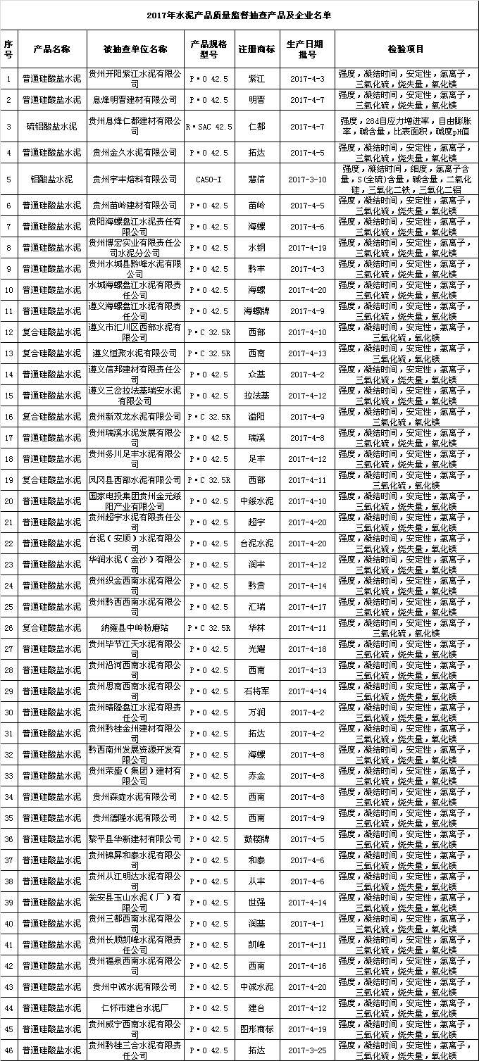 貴州省質量技術監(jiān)督局官網公布2017年水泥產品質量監(jiān)督抽查結果。本次抽查涉及貴陽市、遵義市、六盤水市、安順市、畢節(jié)市、銅仁市、黔東南州、黔南州、黔西南州、仁懷市和威寧縣46家企業(yè)生產的水泥產品46個批次。未檢出問題產品。