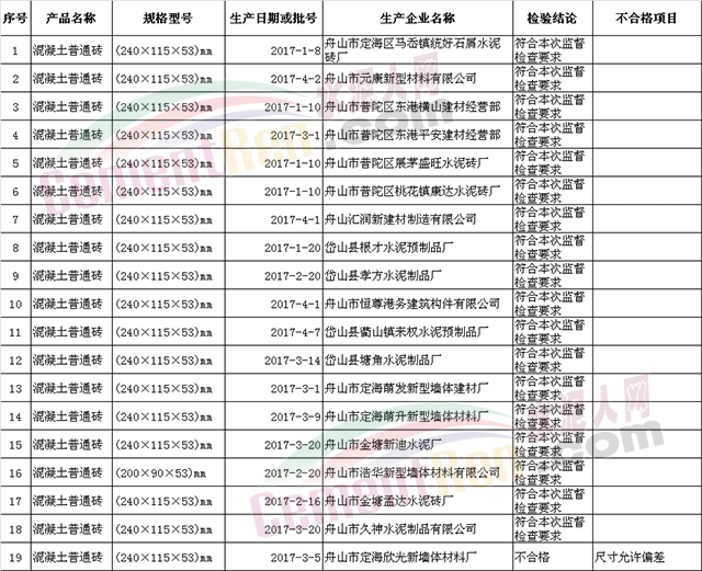 月14日,舟山市市場監(jiān)督管理局官網(wǎng)公布2017年二季度舟山市混凝土普通磚產品市級監(jiān)督抽查結果,該局共抽查了19家企業(yè)的19批次混凝土普通磚產品,合格18批次,不合格1批次,批次不合格率為5.3%。