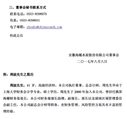 海螺水泥昨日(8日)晚間發(fā)布公告,周波已獲委任為公司聯(lián)席公司秘書(shū),以填補(bǔ)楊開(kāi)發(fā)離職后的空缺,任命于2017年8月8日生效。周波將與公司現(xiàn)時(shí)的公司秘書(shū)趙不渝共同出任聯(lián)席公司秘書(shū)職務(wù)。周波亦獲委任為董事會(huì)秘書(shū),任命于2017年8月8日生效。