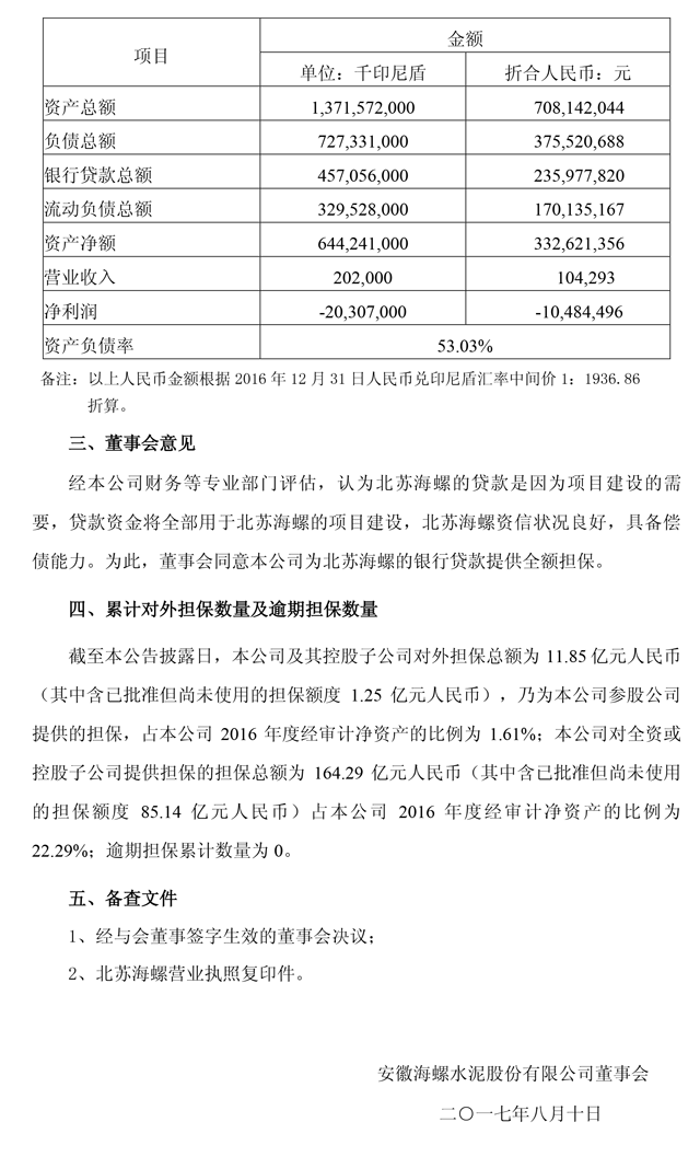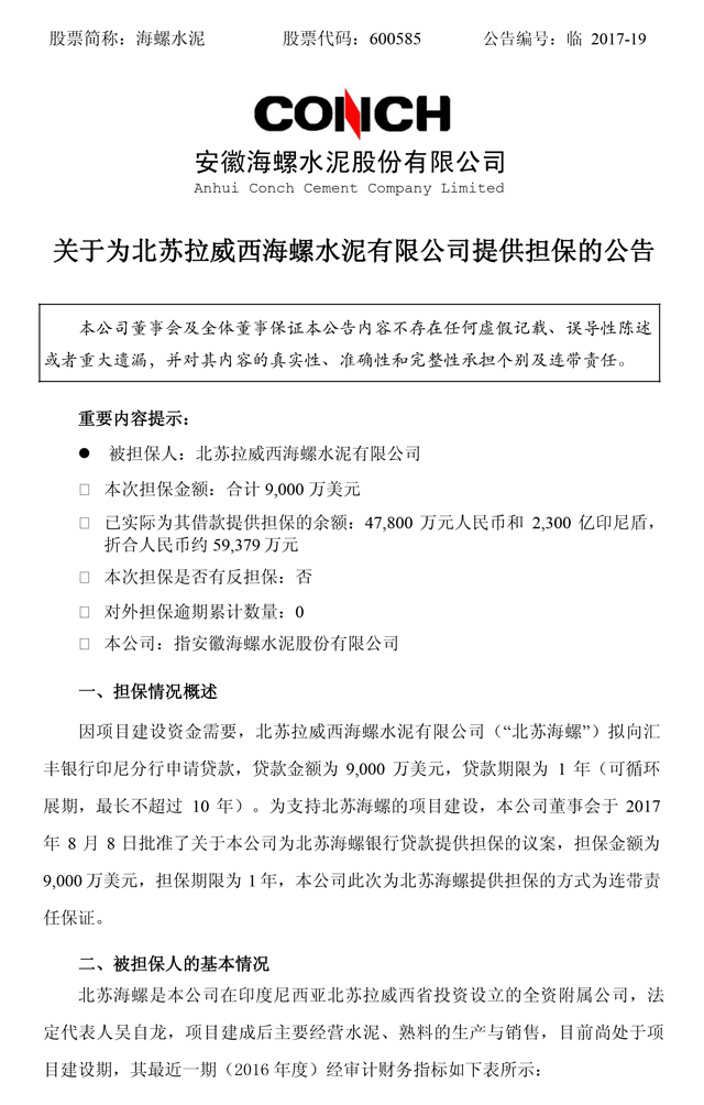 為支持北蘇海螺的項目建設(shè),公司董事會于2017年8月8日批準(zhǔn)了關(guān)于公司為北蘇海螺銀行貸款提供擔(dān)保的議案,擔(dān)保金額為9000萬美元,擔(dān)保期限為1年,公司此次為北蘇海螺提供擔(dān)保的方式為連帶責(zé)任保證。