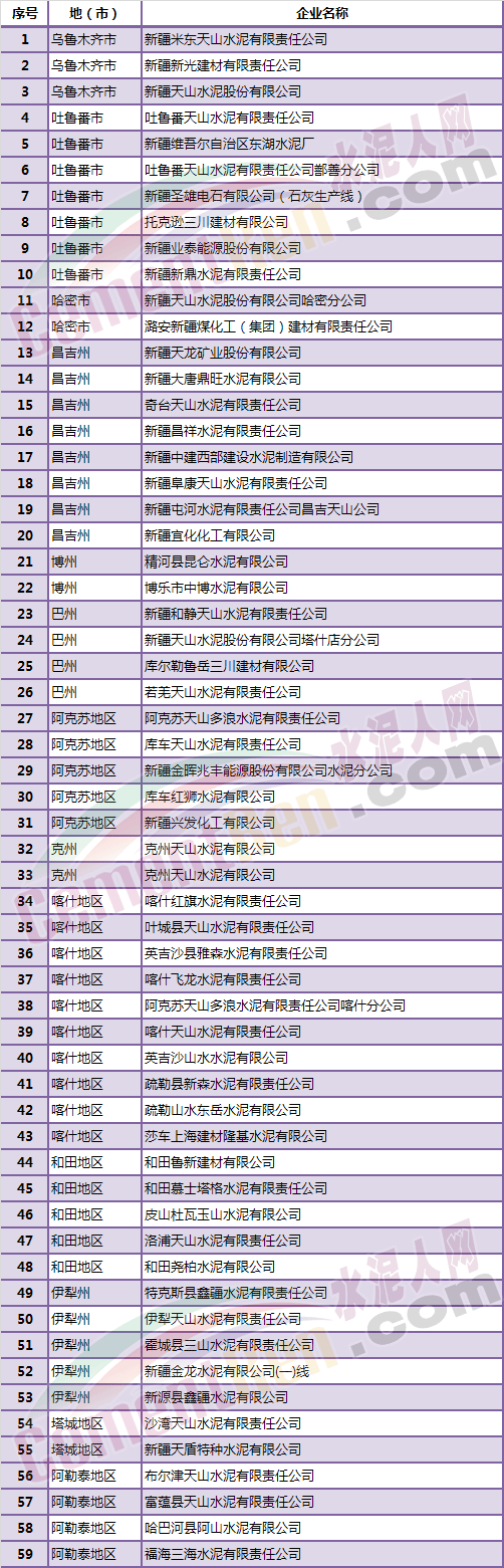 新疆水泥工業(yè)企業(yè)清單