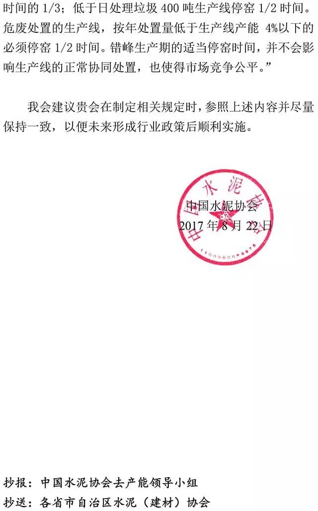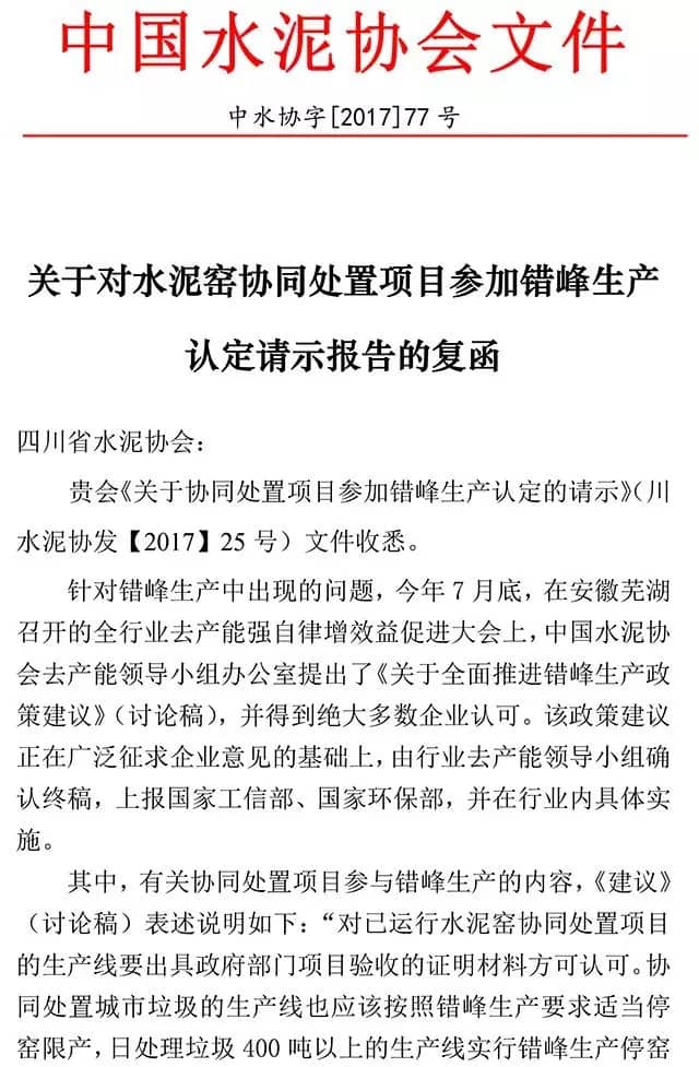 昨日(22日),中國(guó)水泥協(xié)會(huì)回復(fù)四川省水泥協(xié)會(huì)的公函中再一次明確,水泥窯協(xié)同處置生活垃圾和危險(xiǎn)廢物生產(chǎn)線遇錯(cuò)峰生產(chǎn)并不能“免疫”。一則需降低生產(chǎn)負(fù)荷,二則需按相應(yīng)產(chǎn)能適當(dāng)停窯限產(chǎn)。