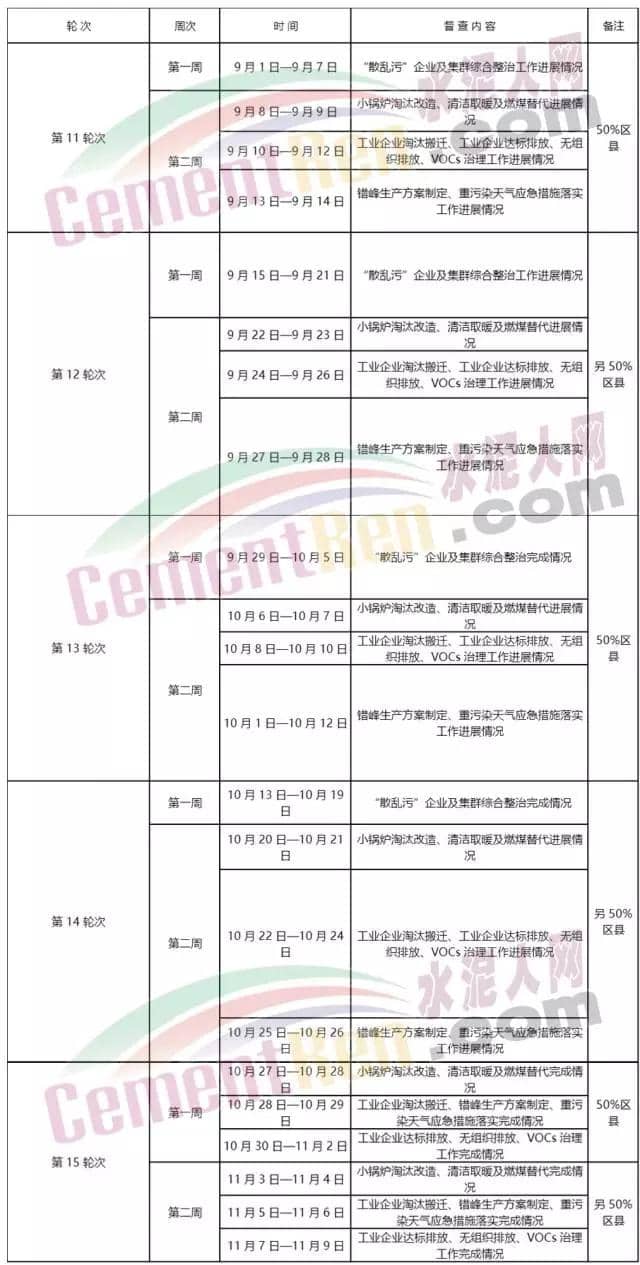 第一階段(2017 年 9 月 1 日至 11 月 9 日),共 5 個(gè)輪次(第 11至 15 輪次)70 天,重點(diǎn)對“2+26”城市所有縣(區(qū))全部 12 項(xiàng)任務(wù)完成情況、各項(xiàng)減排措施的落實(shí)情況、任務(wù)清單外的涉氣類突出問題以及《攻堅(jiān)方案》中“2+26”城市的其他大氣污染綜合治理任務(wù)進(jìn)行督查(具體安排見附 2)。