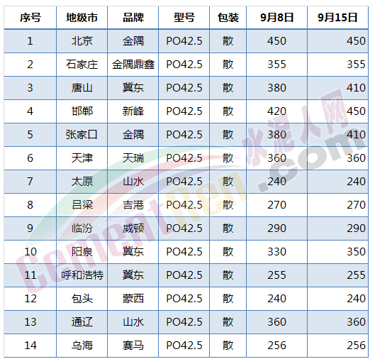 表1 華北地區(qū)及其周邊水泥價格
