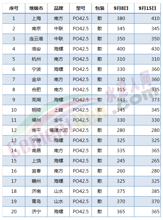 全國各區(qū)域水泥市場價格一覽