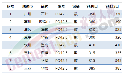 表5 華南地區(qū)及其周邊水泥價格