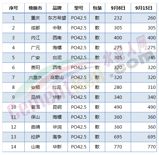 從近期各區(qū)域報價情況看,水泥價格反彈幅度均較大,并且是全國大范圍上漲,一改以往僅是個別地區(qū)上漲,若后期能延續(xù)目前的漲價幅度,四季度將會有多地水泥價格突破今年二季度高點。