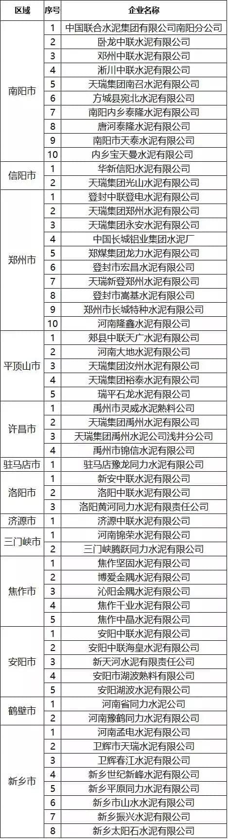 河南地區(qū)水泥企業(yè)名單