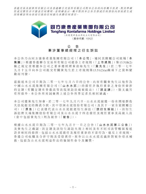 【水泥人網】同方康泰(01312)發(fā)布公告,該公司獲董事總經理黃清海知會,于2017年9月6日,山水水泥接獲一份在開曼群島大法院提交的傳訊令狀,其中亞洲水泥股份有限公司(原告)已表達代表山水水泥提起衍生訴訟。