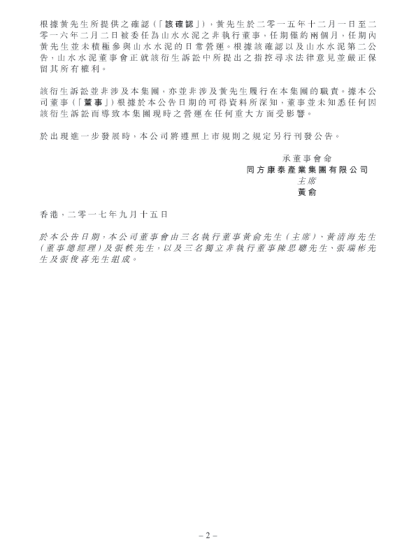 該衍生訴訟將天瑞集團股份有限公司及山水水泥十四名前任及現任董事及高級人員(當中包括黃清海)列為被告。